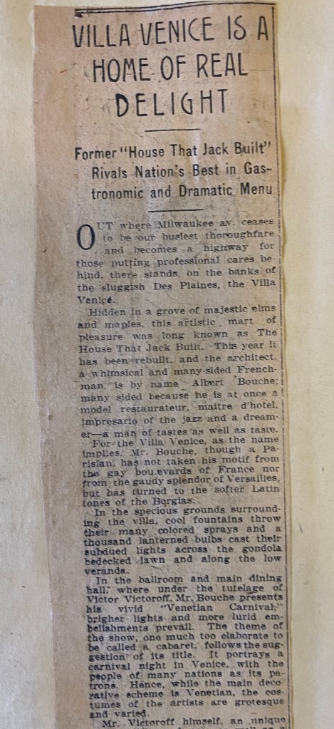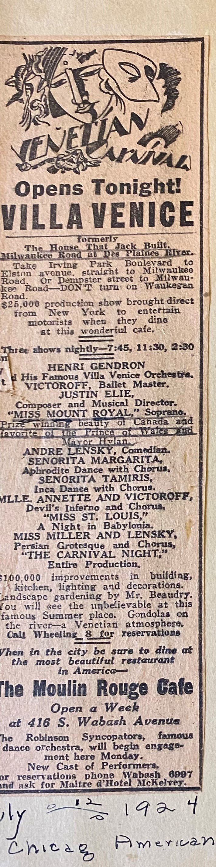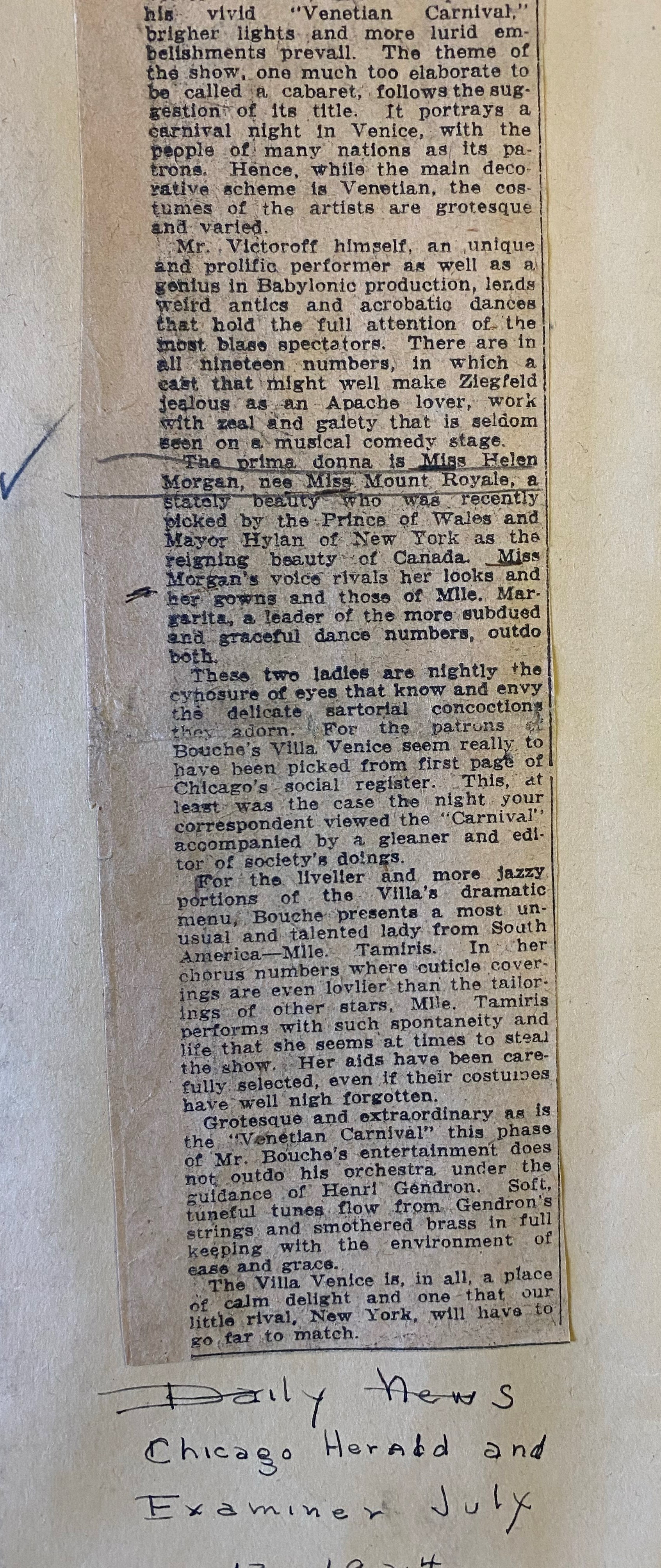Second caveat: Due to a delay in the renovation of the former House That Jack Built into the Villa Venice, owner Albert Bouche placed Helen, and much of his floorshow, into his Loop cabaret, the Moulin Rouge, as a placeholder, on June 4.