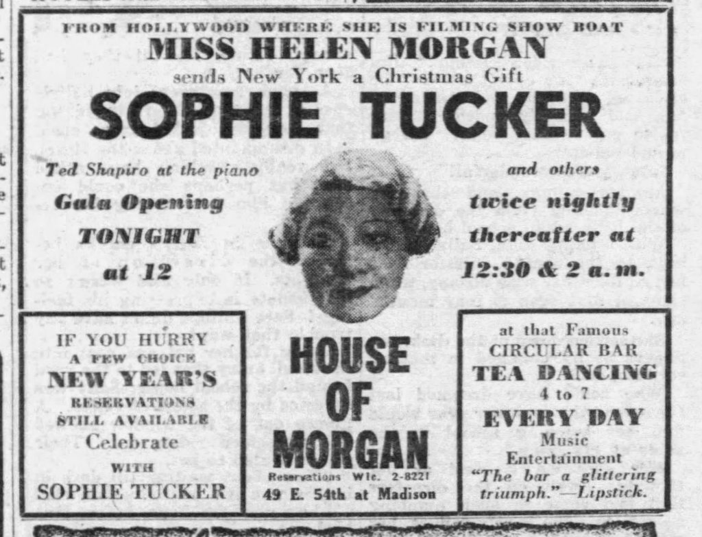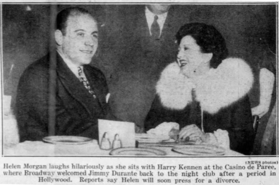 Helen returned to the House of Morgan on January 24, 1936. Joining her were Clifford Newdahl, Carl Randall, and Phyliss Cameron. Dissatisfied with the way Kannen was running her club, in early March she left again, picking up club work in Florida. Beginning March 5, Lillian Roth led the floorshow. When Morgan picked up additional work in Chicago, the House of Morgan closed, on March 21, 1936.