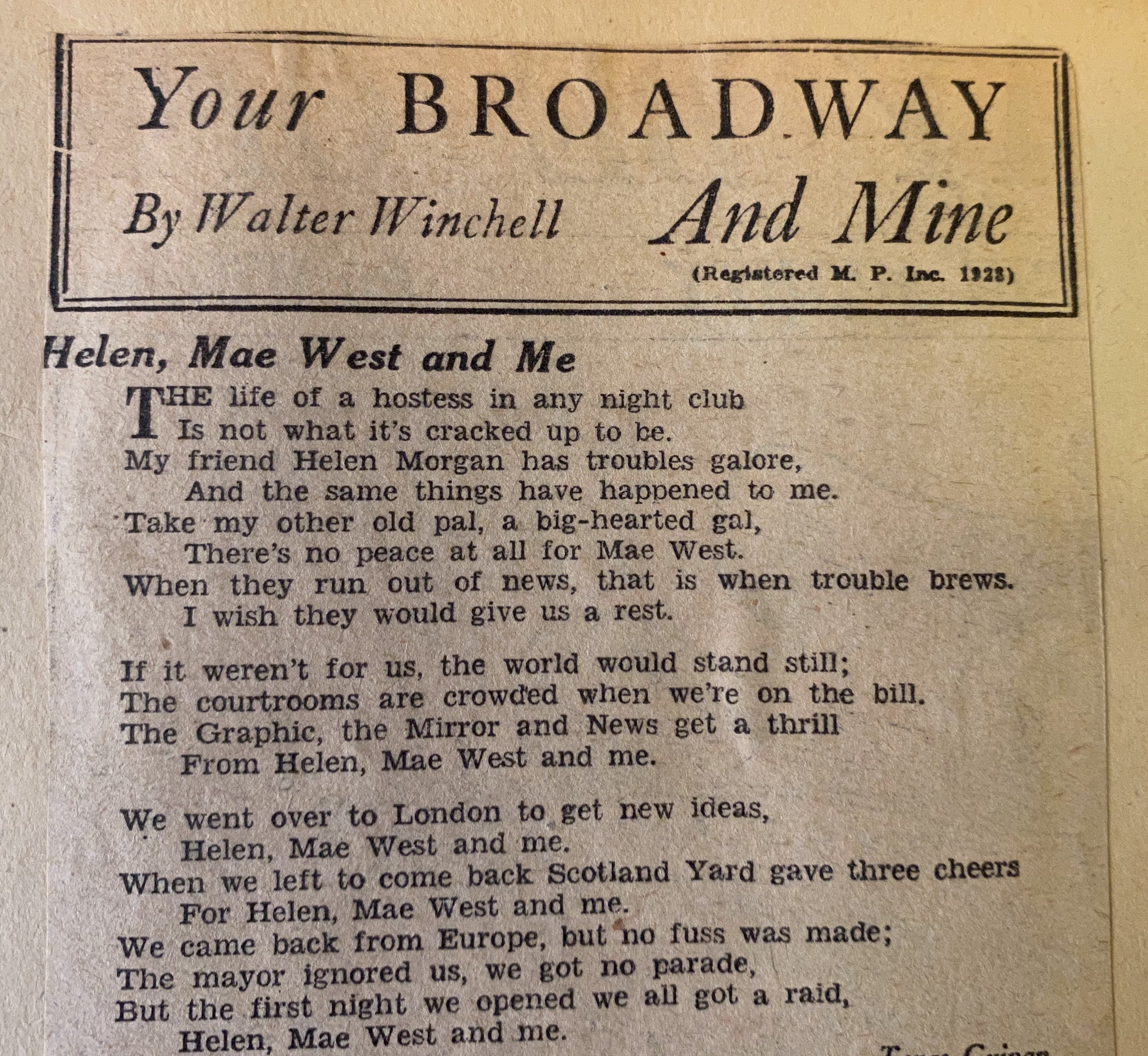 In 1928, Texas Guinan wrote a wryly comic poem about the three raid-prone queens of New York. Morgan and Guinan were among those raided an arrested in the June 1928 prohibition raids. Mae ran into trouble on October 2, 1928, when her latest play, Pleasure Man, was raided and shut down by police following its second performance on Broadway. Mae’s previous scandalous plays, Sex and The Drag were also raided and shut down to protect the morals of New Yorkers. Mae’s depiction of gay men in general, and a drag ball in particular, in The Drag and its reworked iteration, Pleasure Man particularly incensed the morality police.