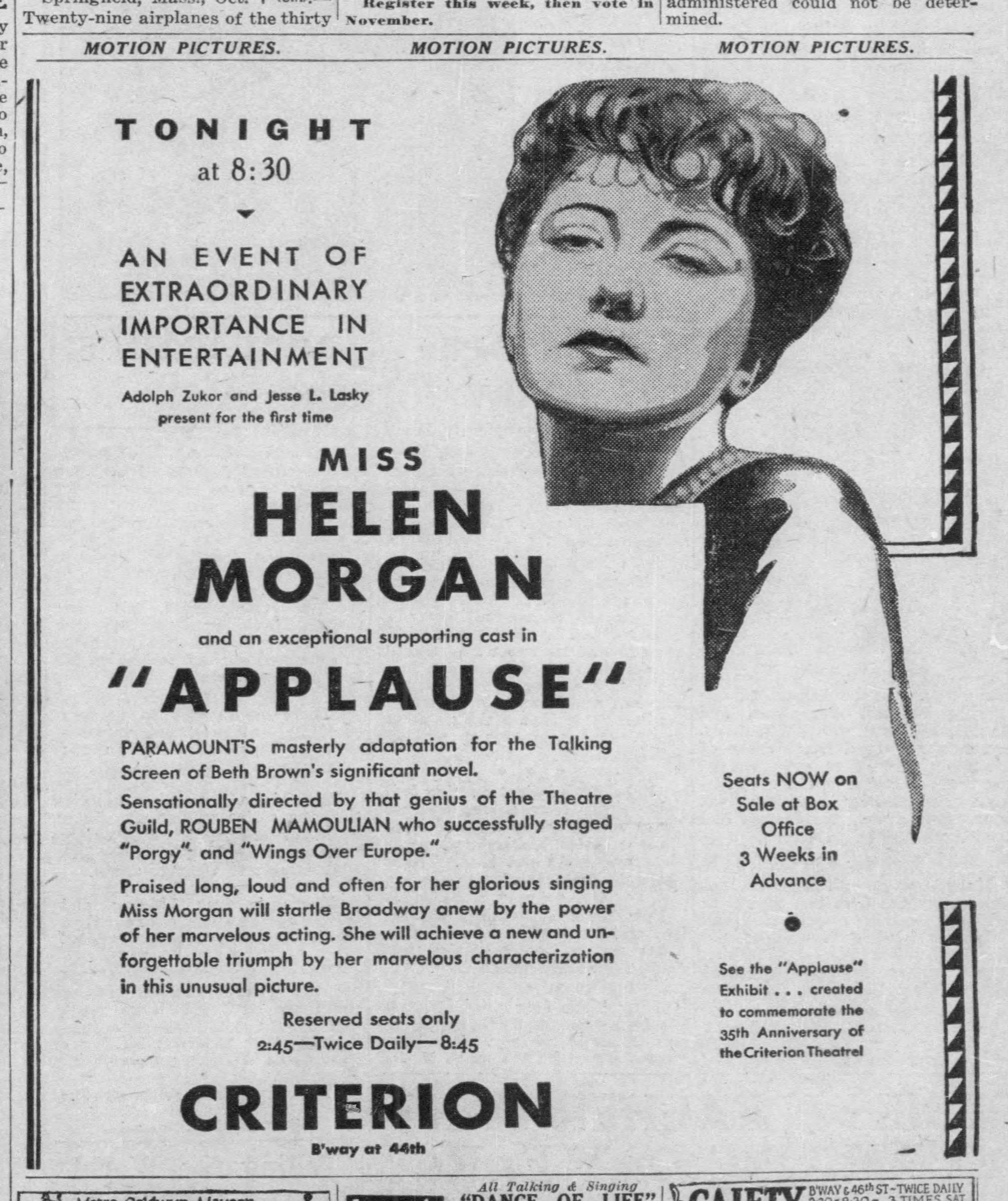 In the evening, Paramount celebrated the world premiere of Rouben Mamoulian’s directorial film debut, Applause.
