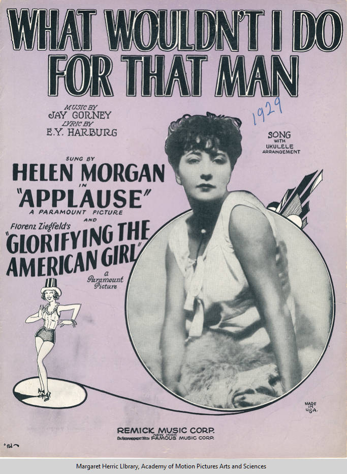 Paramount recycled the tune again in the 1930 Lee Morse short A Million Me’s. The song even got the follow-the-bouncing-ball treatment when Harriet Lee led the singing in the 1931 animated short Any Little Girl That’s a Nice Little Girl. The studio even took Morgan’s footage of “What Wouldn’t I Do For That Man” from Glorifying the American Girl and released it as its own short subject.