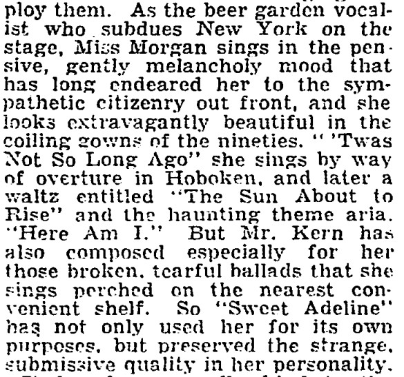 Odder still is that critical reaction in 1929 more often praised Morgan’s other numbers over “Don’t Ever Leave Me!” That’s not to say that critics and the public did not care for “Don’t Ever Leave Me!” – they did, but not with the same level of enthusiasm shown to her other songs in the show, as displayed by Brooks Atkinson’s review in The New York Times:
