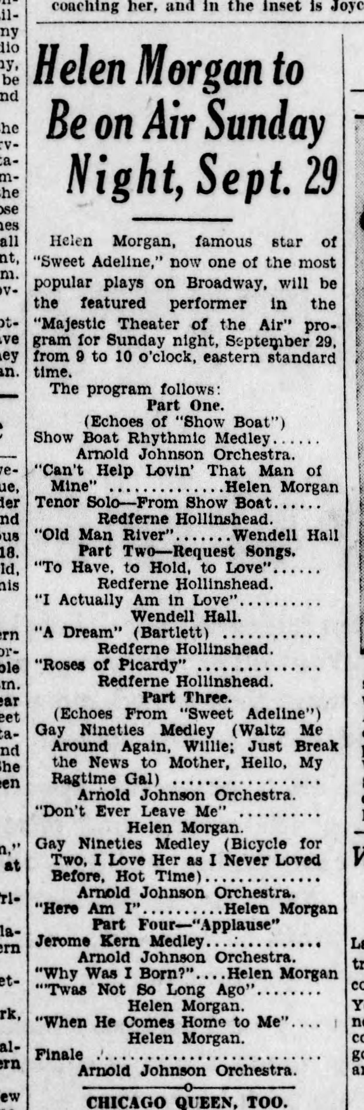 Morgan continued to sing her other Sweet Adeline songs in concert and on the radio, as the roster from a September 1929 appearance on The Majestic Theatre on the Air so tantalizingly indicates: